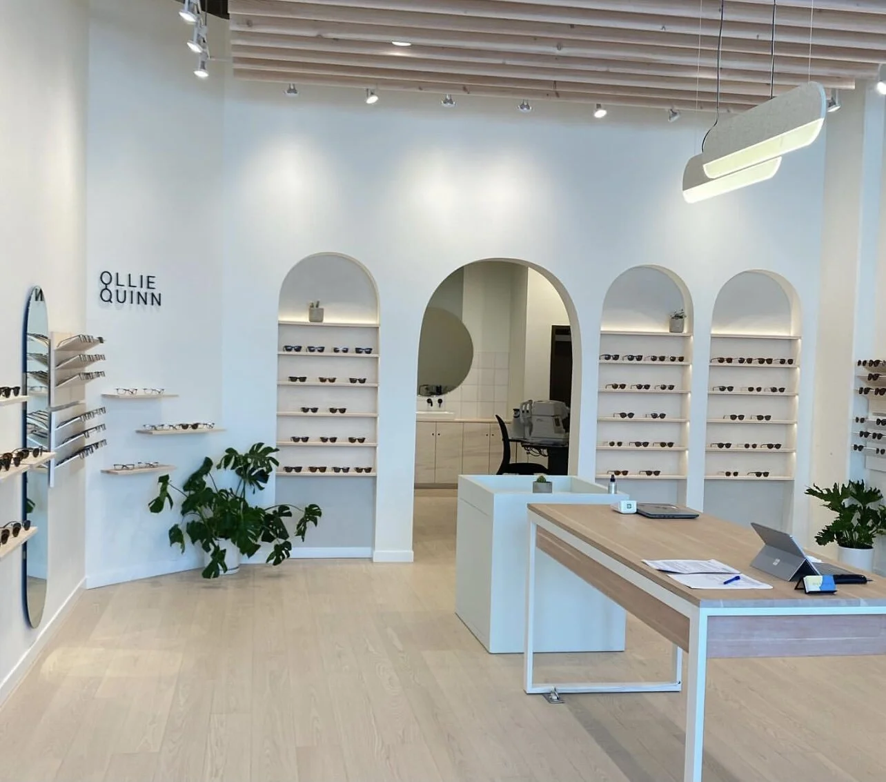 Newly designed for the North Vancouver location of Ollie Quinn eyewear and optometrist lab, the shop showcases eyewear under a lit canopy of arches. Clay walls, overhead spans of large timbers, and a monochromatic colour palette of light wood tones playfully interact with the Northern light streaming into the space on Lonsdale. Artfully designed with the intent for a forest bathing vibe while at this space.